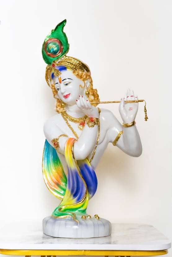 BEAUTIFULLY CRAFTED KRISHNA JI PLAYING FLUTE, INTRICATELY DETAILED RESIN FIGURINE FEATURING VIBRANT MULTI COLOUR ATTIRE WITH GOLDEN ACCENTS AND ORNATE PEACOCK CROWN.